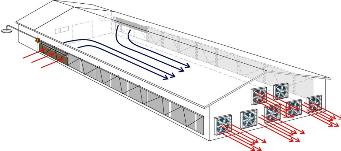 Longitudinal ventilation: cooling by fan and wet curtain. The calculation of the ventilation system should be based on the pig's body weight in order to obtain the best wind speed.