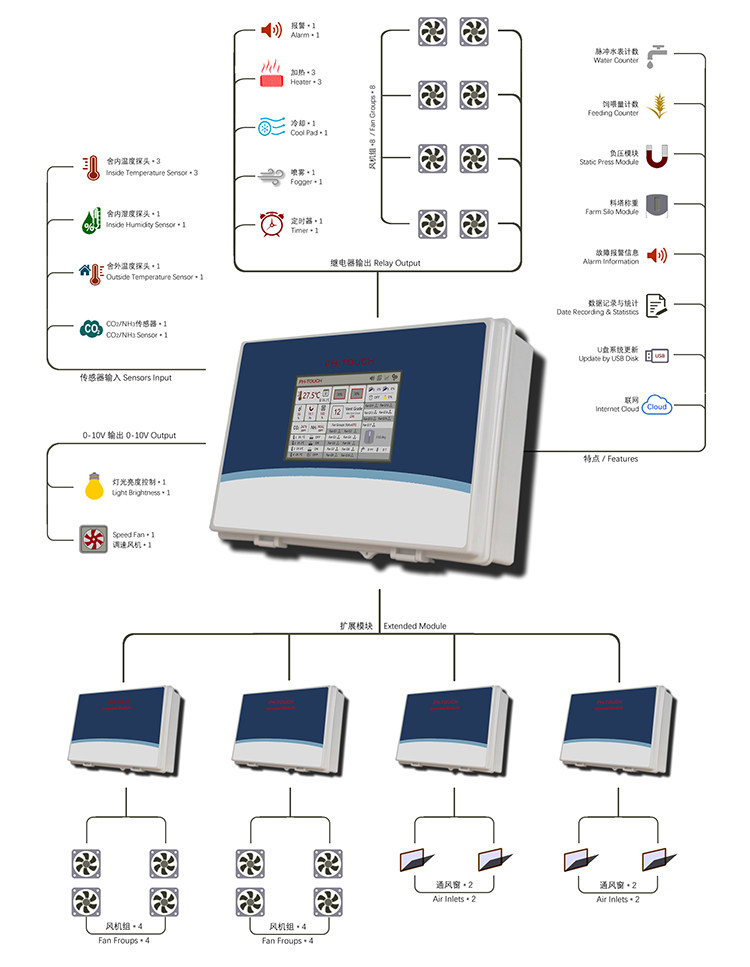 PH-TOUCH 是我公司推出的新一代禽舍環(huán)境控制器,采用7寸觸控顯示屏,最多到16組風(fēng)機(jī)組,24級通風(fēng)級別,多達(dá)31組繼電器輸出,模塊化的設(shè)計,滿足不同用戶的需求。